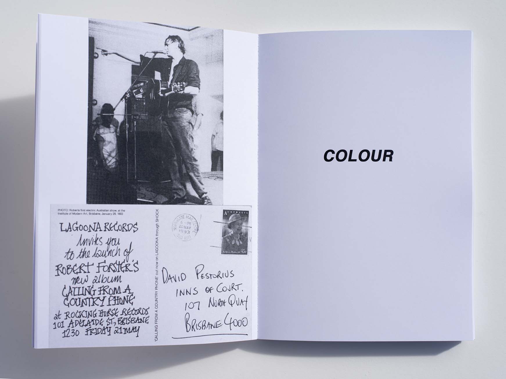 To celebrate the occasion of Heimo Zobernig's 15 year survey of his Australian works, the artist has collaborated on the production of a limited edition artist's book of lyrics by Brisbane singer-songwriter Robert Forster. Edited by David Pestorius, the book is the first devoted to Forster's lyrics and includes more than 50 songs from all phases of his now four-decade long career with The Go-Betweens (1978–1989; 2000–2006) and as a solo artist (1990–1999; 2006–). The selected songs are grouped thematically under headings (eg. 'Colour', 'Desire', 'Divide', 'Conquer', 'Contempt', 'Place', 'Point of View', to cite just some), which serve to enhance the often oblique nature and interpretative potential of Forster's lyrics. The book adopts a rough truth-to-materials approach, with the typography and layouts from original album sleeves and CD booklets redeployed where possible. The book also includes a brief biographical entry, a discography, and a small selection of illustrations that constitute a parallel narrative, which points up Forster's historical engagement with artists and the world of art. Lyrics of Robert Forster is published by KANN-Verlag, Frankfurt, 2015, 21 x 14.7 cm, b&w, 140 pages, perfect bound, with offset printed cover by Heimo Zobernig, in a limited edition of 120 copies.